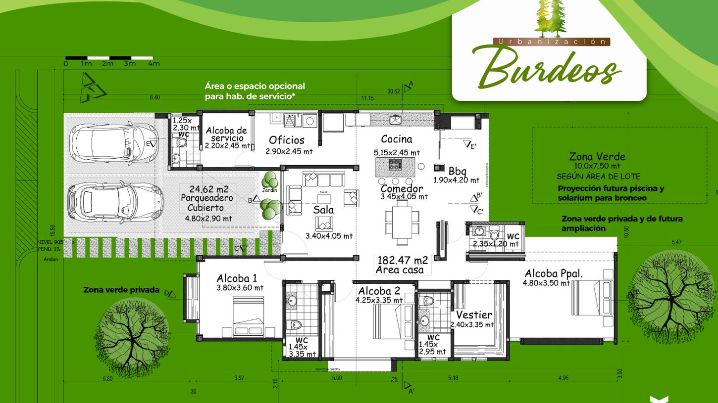 PROYECTO BURDEOS: VIVIENDA UNIFAMILIAR EN 1 PISO 🏡 ÁREA DE LOTE URBANO: Desde 400 m² hasta 480 m² ÁREA CONSTRUIDA DE VIVIENDA: 182 m² Este exclusivo proyecto está diseñado para quienes buscan un hogar moderno, cómodo y funcional. Las viviendas unifamiliares de 1 piso están pensadas para brindarte la tranquilidad y el confort que necesitas, con un diseño que optimiza cada espacio. Distribución y características de la vivienda : 1 alcoba principal 🛏️ con vestier y baño privado 🚿 para mayor privacidad y confort. 2 alcobas secundarias con closet 👚, ideales para los hijos o como espacios adicionales. 1 baño de alcobas 🚽 para compartir entre las alcobas secundarias. 1 baño social 🛁 para las visitas. Área de estudio o cuarta alcoba con baño 📚🛁, perfecto para trabajar desde casa o recibir huéspedes. Cocina tipo isla 🍳 moderna y abierta, conectada con la sala y comedor para integrar los espacios. Zona de terraza BBQ 🍖 para disfrutar de reuniones familiares o con amigos. Zona de ropas 🧺 para mayor comodidad. Parqueadero cubierto para 1 vehículo 🚗 y parqueadero descubierto para 2 vehículos más 🚙🚙. Zona verde de futuras ampliaciones 🌳, con la opción de expandir tu hogar según tus necesidades. Beneficios adicionales : Red de gas 🔥 y agua caliente 💧 con calentador para tu bienestar diario. Tanque de reserva de agua 💦 para garantizar suministro constante. Portería con puerta eléctrica 🚪 para mayor seguridad. Acueducto y alcantarillado 💧 para tu comodidad. Redes eléctricas subterráneas ⚡ para una mejor estética y seguridad. Vías amplias y asfaltadas 🚗 para una circulación cómoda y segura. Andenes 🏙️ para mejorar la accesibilidad. Opciones de entrega : Obra gris habitable 🏗️: $695.000.000 Totalmente terminada 🛠️: $845.000.000 Venta de Lotes : Además de la vivienda, si lo deseas, también puedes adquirir el lote por separado . Contamos con 9 lotes disponibles , cada uno con diferente área. Lote 1 : 483 m² Lote 2 : 477 m² Lote 3 : 478 m² Lote 4 : 467 m² Lote 5 : 458 m² Lote 6 : 454 m² Lote 7 : 401 m² Lote 8 : 386 m² Lote 9 : 402 m² Precios de los lotes : Lotes 1 a 6 : $350.000.000 Lote 7 : $330.000.000 Este es el lugar perfecto para quienes buscan un hogar con gran potencial de expansión y desarrollo, en una zona tranquila y segura. ¡No dejes pasar la oportunidad de ser parte del Proyecto Burdeos! 🌟